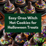 These Tasty Oreo Witch Hat Cookies are a festive, no-bake Halloween treat featuring classic double-stuffed Oreo cookies transformed into adorable witch hats using melted chocolate, Hershey’s Kisses, and colorful Halloween sprinkles. Perfect for parties or a fun seasonal snack, these cookies are easy to make and delightfully spooky.