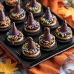 These Tasty Oreo Witch Hat Cookies are a festive, no-bake Halloween treat featuring classic double-stuffed Oreo cookies transformed into adorable witch hats using melted chocolate, Hershey’s Kisses, and colorful Halloween sprinkles. Perfect for parties or a fun seasonal snack, these cookies are easy to make and delightfully spooky.
