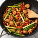 The image shows a close-up of a black wok filled with a stir fry mix. Inside, there are several visible layers: chunks of light brown cooked chicken, dark brown roasted cashew nuts, and bright green scallions cut into long pieces. Thin slices of red chili peppers are scattered on top, adding a pop of color. The ingredients have a shiny, glazed texture from the sauce, and a wooden spatula is resting inside the wok on the right side. The wok sits on a white marbled surface. Photo taken with an iphone --ar 4:5 --v 7