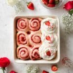 These Vegan Strawberry Sweet Rolls are soft, fluffy, and filled with a luscious homemade strawberry and raspberry compote. Topped with a creamy dairy-free frosting and adorned with freeze-dried berries and fresh strawberries, these rolls are a delightful plant-based treat perfect for breakfast or dessert.