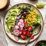 This vibrant Vegan Taco Salad combines fresh romaine lettuce, black beans, corn, tomatoes, radishes, and creamy avocado with a zesty homemade Taco Salad Dressing. Perfect as a light meal or a refreshing side, it’s packed with plant-based protein and bursting with flavors from lime and cilantro. Optionally served in a crispy tortilla bowl for that added crunch and presentation.