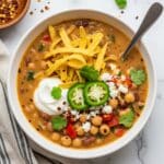 This Vegan White Chickpea Chili is a flavorful and hearty plant-based dish, combining garbanzo and pinto beans with vibrant spices, creamy coconut milk, and zesty salsa verde. Perfect for a cozy meal, it’s loaded with fresh vegetables and garnished with homemade tortilla strips and fresh lime for a delightful finish.