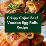 These Voodoo Egg Rolls are a delicious twist on the classic appetizer, featuring a flavorful Cajun-spiced ground beef filling with cheddar cheese, green onions, and carrots, all wrapped in crispy egg roll wrappers and fried to golden perfection.