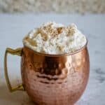 A shiny copper mug with a hammered texture and a golden handle is filled to the top with fluffy white whipped cream sprinkled with light brown cinnamon powder, creating a soft, cloud-like layer on top. The mug sits on a white marbled textured surface that adds a clean and bright background contrast to the warm tones of the mug and spice. photo taken with an iphone --ar 4:5 --v 7